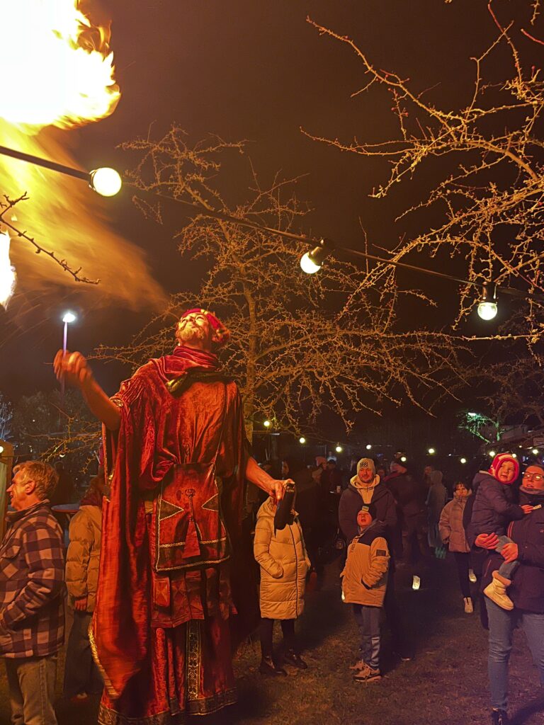 Kerzenziehen, Nussrutsche und später die Show von Hummlerus mit Gaukelei und Feuerspiel ließen die Menge staunen und brachten Licht und Wärme in die frühe Abenddämmerung.