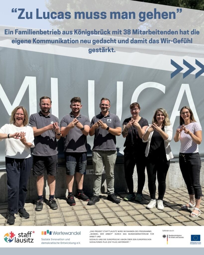Auf STAFF*Lausitz wurde das Unternehmen durch eine persönliche Empfehlung aufmerksam: Die Personalverantwortliche eines befreundeten Unternehmens berichtete von positiven Erfahrungen mit den Projekten vom Verein Wertewandel. Schnell war klar: Auch die Lucas Group möchte die Chance nutzen, um die eigenen Strukturen weiterzuentwickeln.