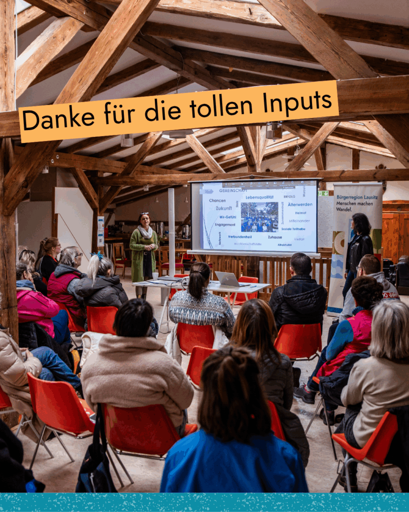 Hier brachten die Anwesenden eigene Themen ein, arbeiteten in Kleingruppen und vernetzten sich aktiv. Das Feedback war eindeutig: der Tag wurde als bereichernd, mutmachend, inspirierend und praktisch relevant wahrgenommen. Insbesondere der Projektraum Drahnsdorf bot mit seiner Atmosphäre den idealen Rahmen, um Ideen sofort auszuprobieren.